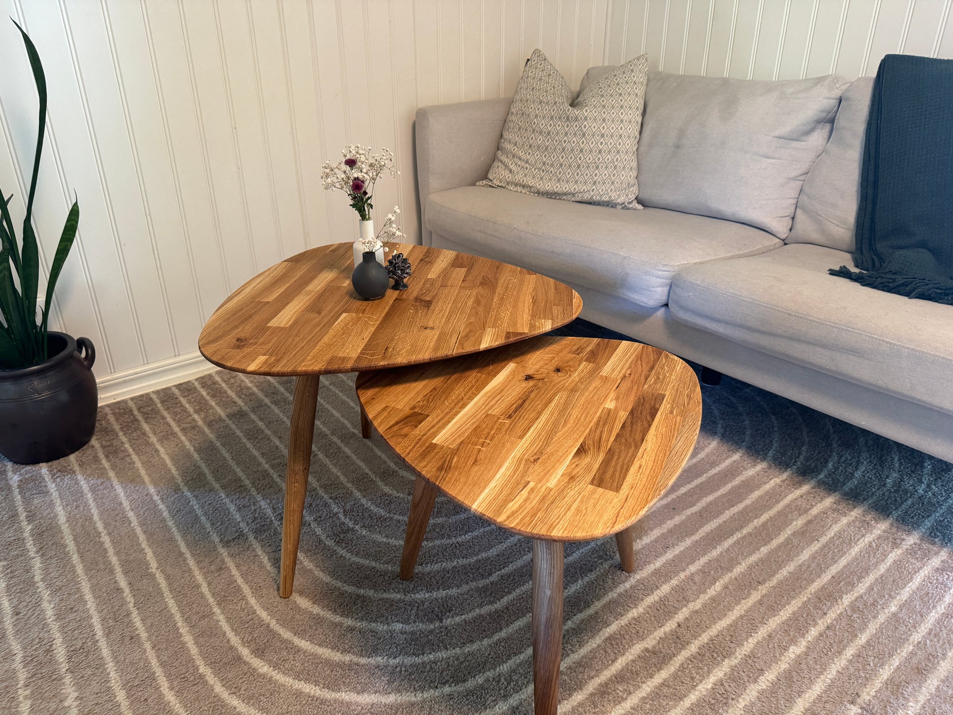 Rejält soffbord i stavlimmad Ek, behandlat med bivax. Det finns 8st olika former, 4st storlekar och 2st höjder att välja bland.